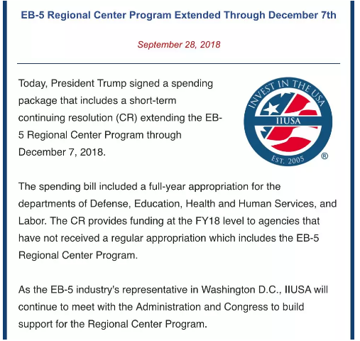 随着川普签署临时预算案,IIUSA宣布,EB-5已获延期至12月7日。