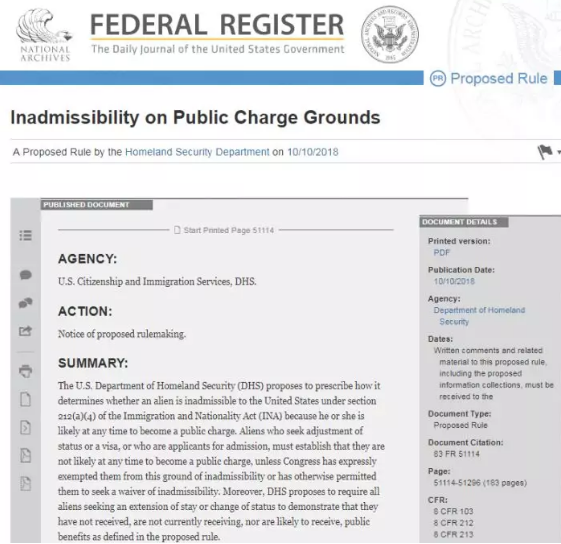 美国国土安全部(DHS)10月10月在“联邦公报”(Federal Affairs)上公布《公共负担不予受理》(Inadmissibility on Public Charge Grounds)新规,首次将领取福利作为是否批准绿卡的考量因素之一。