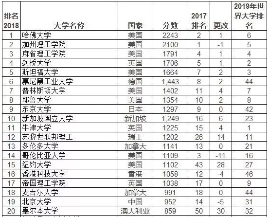 美国高校仍然占据绝对优势,共56所院校上榜,在前十名中占据6席,其中,哈佛大学、加州理工学院和麻省理工学院依次位列前三名。