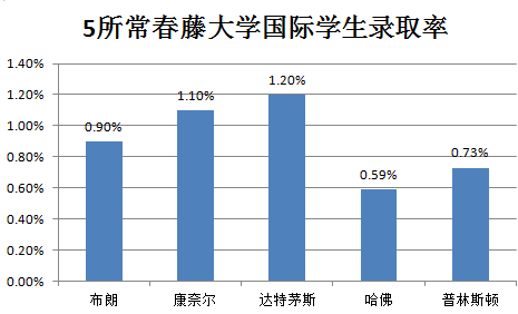 在公布国际学生录取率的5所常春藤学校中,录取率在1%上下浮动,就业力榜单中的首位哈佛录取率为0.59%,是录取率最低的。可见对于国际学生来说,想进哈佛,竞争情况异常激烈。