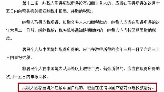 有关居民个人移居境外注销中国户籍的情况,新个人所得税法中一共提到了两处。两处皆表明:纳税人因移居境外注销中国户籍的,应当在注销户籍前办理税款清算。