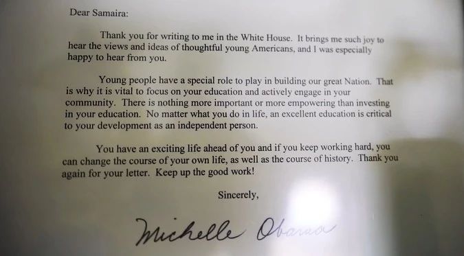 奥巴马的夫人甚至亲自写了一份信鼓励她“请继续奋斗下去,你不仅能改变自己的命运,还可能改变历史!”