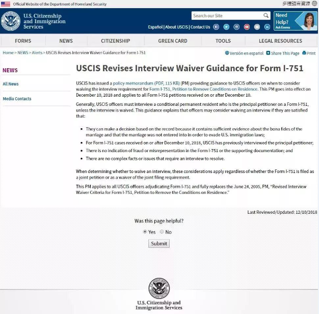 移民局公布:通过婚姻移民的临时绿卡转正式绿卡不再需要面谈了! 自2018年12月10日生效,适用于12月10日或之后收到的所有I-751表格申请。