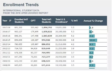 根据美国国际教育协会发布2018年门户开放报告,美国高校留学的国际生创下了近109万人的历史新高。