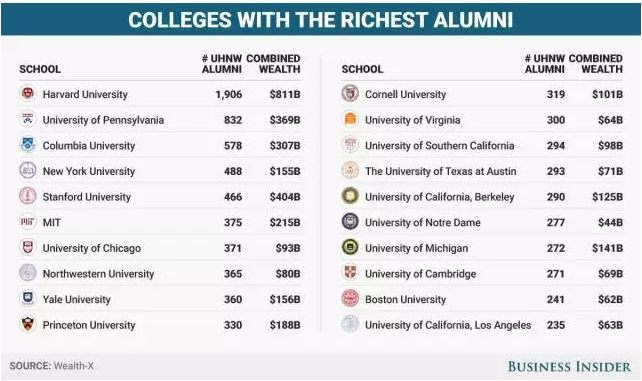 关于这一点,财富咨询机构Wealth-X发布的报告给出答案:全球诞生超高净值人士(净资产3000万美元以上)最多的20所大学中,有19所位于美国,唯一的例外是英国剑桥大学。其中5所大学是公立大学,6所是“常青藤”大学。