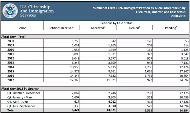 移民局公布了最新一个季度,2018财年第4季度(2018年7月1日至9月30日),EB-5案件递件和审批数据。
