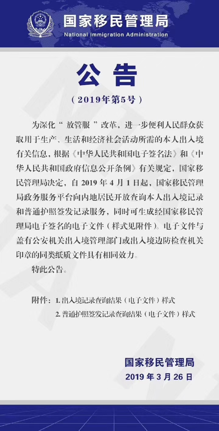 又一好消息!自2019年4月1日起,国家移民管理局政务服务平台向内地居民开放查询本人出入境记录和普通护照签发记录服务,同时可生成经国家移民管理局电子签名的电子文件。