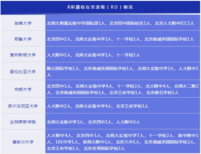 ED/EA录取批次中,中国学生占总录取的比例能低至0.43%!而近日放榜的常规申请(RD),中国学生的录取情况同样惨烈,以8所藤校在北京录取的情况来看: