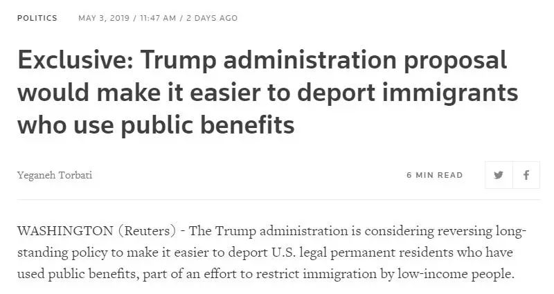 5月3日,根据路透社报道,川普政府着手准备草拟一项新的规定:新的规定将扩大公共福利的定义,以便将那些使用过某些公共福利的合法居民驱逐出境,阻止那些低收入移民进入美国。