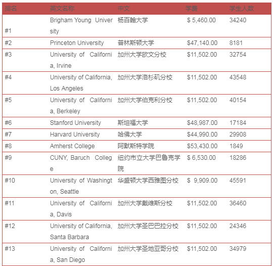 这次排名第一的是杨百翰大学,是不是很意外呢?去年UCLA和UCB位列1和2。
