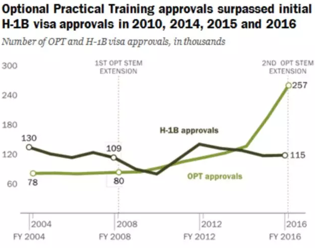 比起又要雇主支持、又要抽签的H-1B,OPT申请的“宽容”程度实在令人感动。所以OPT使用人数上超过了H-1B:2004-2016年间,共有1,474,000人使用OPT工作,而H-1B的这一数字为1,473,000。