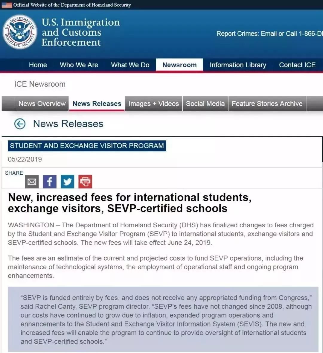 5月22日,美国移民和海关执法局发布最新通知,自 2019 年 6 月 24 日起,美国 J1 签证 SEVIS 费用从180美金增加为220美金。(这些费用是对 SEVP 运营的当前和预计成本的评估,其中包括技术系统的维护、运营人员的雇用和正在进行的项目改进。)