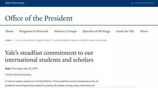 5月23日,耶鲁大学的校长Peter Salovey发表声明,对国际学生和学者以及国际科学合作表达了坚定不移的感谢和支持。最后,他还提醒同学们,“遇到签证或其他任何问题,请联系耶鲁的国际学生和学者办公室。”