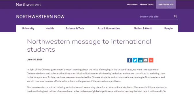 6月7日,西北大学发表了一封致中国学生的公开信。表明:西北大学向在校的及即将来校的全体中国学生和学者保证,西北大学有责任和义务帮助学生获取签证。并且到目前为止,没有任何西北大学的中国学生及学者的签证申请得到拒签。
