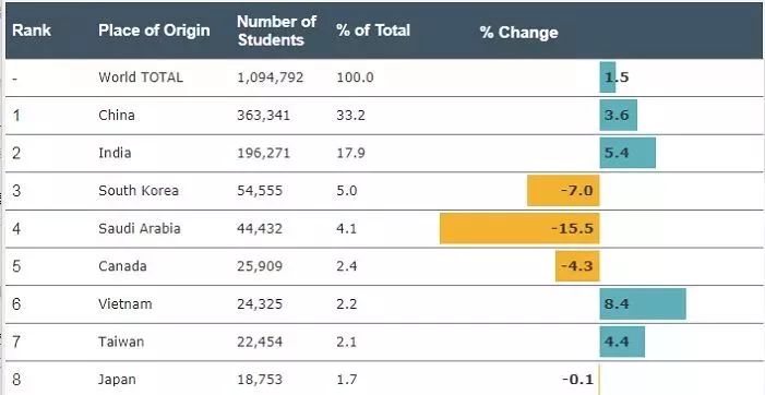 根据2018年11月13日发布的最新《美国开放门户报告》显示,在2017到2018学年中,在美国学习的国际学生人数达到有史以来的最高109万人。而中国是美国第一大生源国,2017/2018年度共计有363,341名中国大陆留学生赴美留学,占据总国际学生人数的33.2%,贡献了超138亿美元。