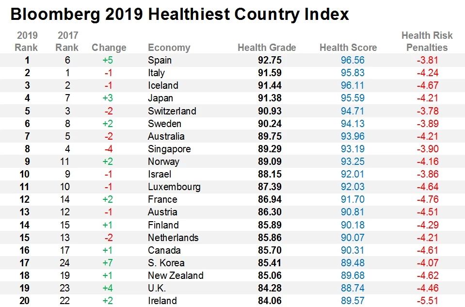 2019彭博健康国家指数(Bloomberg Healthiest Country Index)出炉,对生活在169个经济体中的公民的整体健康程度进行排名。