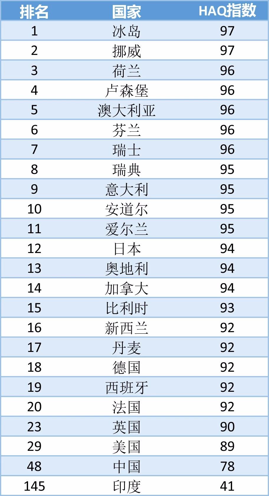 权威医学期刊《柳叶刀》发布了2016年全球医疗可及性与质量(以下简称HAQ指数)排行榜,此次排名基于对全球195个国家和地区的HAQ指数进行了比较,研究团队根据32种非绝症疾病的死亡率、这些疾病的医疗服务进步情况,推出了HAQ指数。
