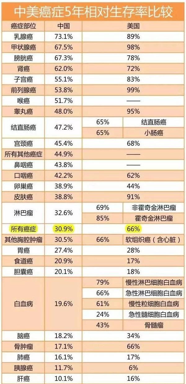 根据2015年美国癌症协会与2015年全国临床肿瘤学大会的统计数据,中国美国在癌症五年整体存活率上有着显著差距,甚至低至30.9%对比66%。
