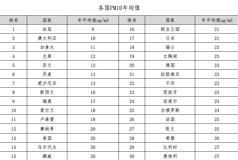 可以发现,榜上的前30名大多来自欧洲、澳洲和美洲国家,PM10即可吸入颗粒物的年平均值都在可接受范围之内。