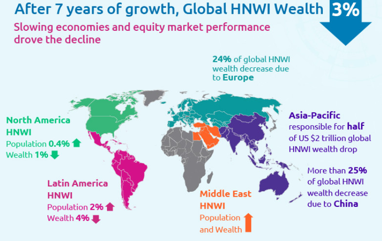 据《2019世界财富报告》还指出,在全球总财富减少的2万亿美元中,亚太地区占了一半。值得一提的是,中国百万富翁的财富下滑占亚太地区的53%,可见全球财富减损的其中1/4都由中国引起。