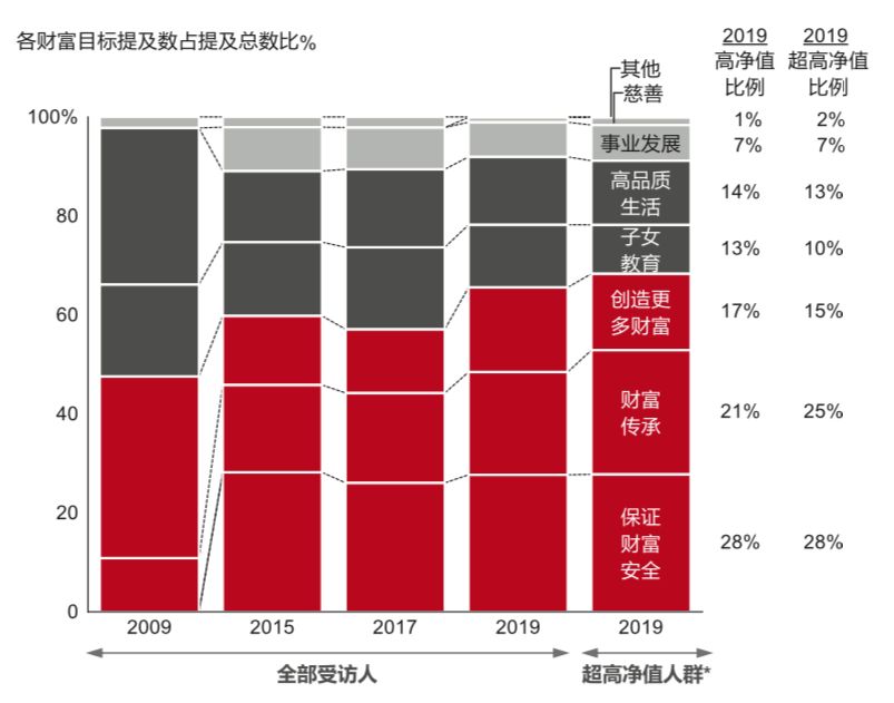 由于近年来各类资产风险波动增大,高净值人士在调研中显示出两大财富投资目标:财富保障与财富传承。