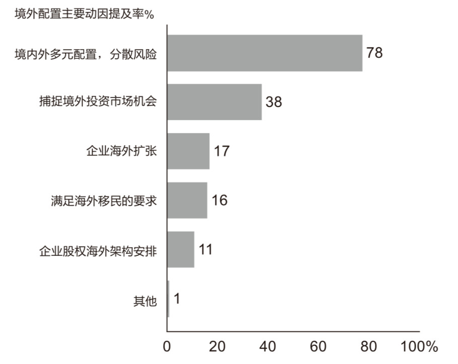 由于宏观环境的不确定性,如经济增长放缓、经济结构调整等,高净值人群出于“资产配置,分散风险”的考虑,海外资产配置已经成为资产配置必要选项。超过一半以上的受访高净值人群表示通过境内外多元配置分散风险为海外资产配置的主要目的。