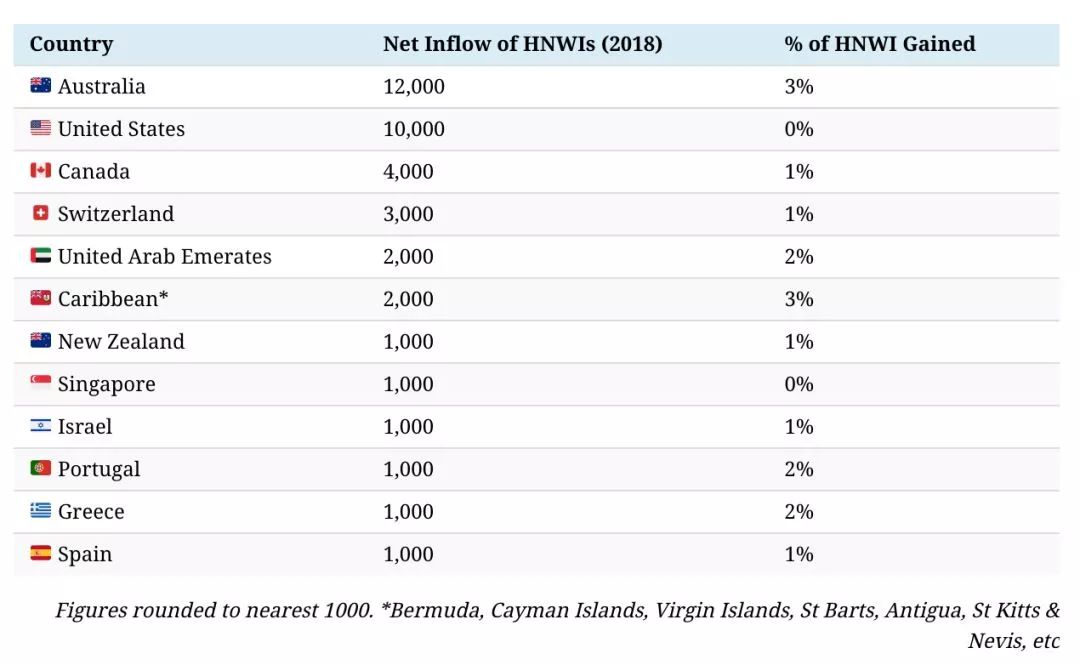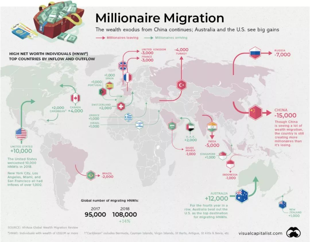 据《2019年度世界财富迁移报告》显示,中国是百万富翁选择移民人数最多的国家,2018年有超过15,000名富翁离开中国,而澳大利亚是百万富翁移入数量最多的国家,其次是美国。