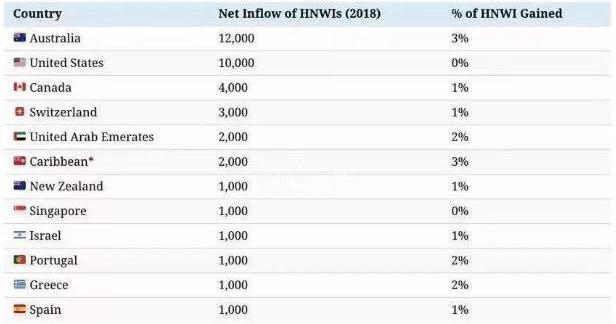 至于富豪们移民的目的地,《2019世界财富迁徙报告》显示,澳大利亚、美国、加拿大、瑞士依然是传统意义上的移民输入大国,大部分富豪都带着万贯家财投奔了这里。