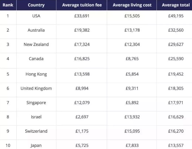 英国:平均学费£8994,总的留学费用在£18305,位列世界第六贵的留学国家;