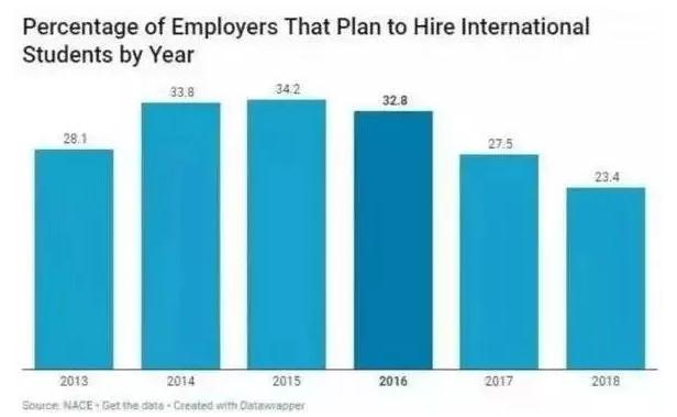 雪上加霜的是,由于H1B政策的缩紧,更多企业已经不愿意招聘国际学生。2018年的一项调查显示,只有23.4%的受访雇主表示愿意雇佣国际学生。