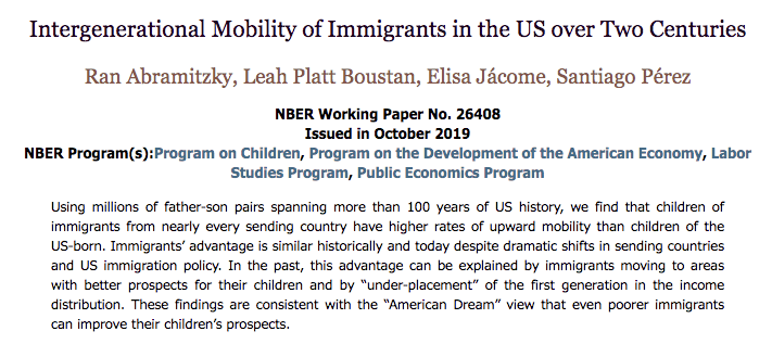 研究人员表示:“无论移民发生在何时来自何地,移民后代同美国出生的同龄人相比,打破社会阶层,向上流动的概率更高。并且这种概率同过去的移民相比基本相似。”来自中国、印度、越南的移民后代,成年后收入超过60%及以上的美国人,而同样情况的美国本土后代仅超过46%的人。