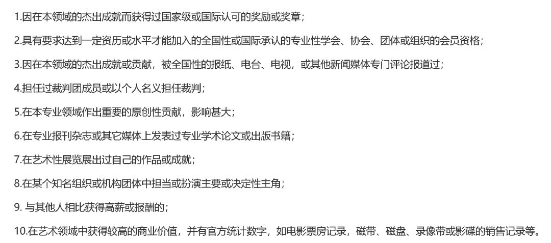 对职业没有具体要求,只要你在所在行业做得足够出色,就能具备申请资质。达成条件只要满足移民局对特殊人才的十条测定标准的其中三条即可获批。
