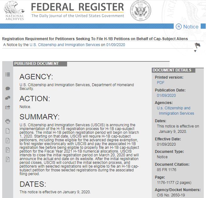 1月9日,美国联邦政府federal register网站公告了移民局关于2020年H-1B申请政策(Registration Requirement for Petitioners Seeking To File H-1B Petitions on Behalf of Cap-Subject Aliens)的新法规。