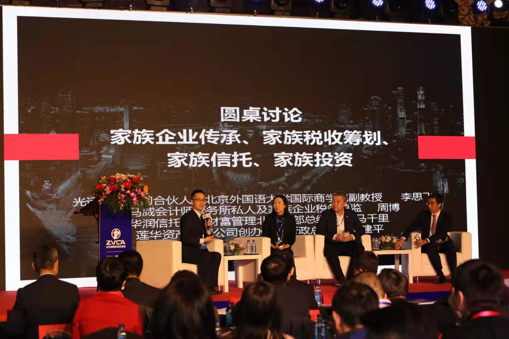 接下来的圆桌论坛环节,由北京外国语大学国际商学院副教授李思飞主持,毕马威会计师事务所私人及家族企业税务总监周博女士、华润信托公司财富管理北京一部总经理马千里先生,莲华资产管理公司创始人及行政总裁李建平先生,四位嘉宾围绕家族治理、财富传承的重点和难点问题进行了热烈讨论和专业阐释。
