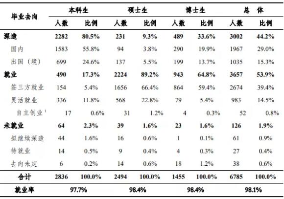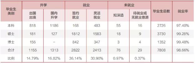 截至2019年10月31日,北京大学全校总体就业率为97.83%,北京大学校本部就业率为98.66%。其中,出国(境)留学比例为14.79%。