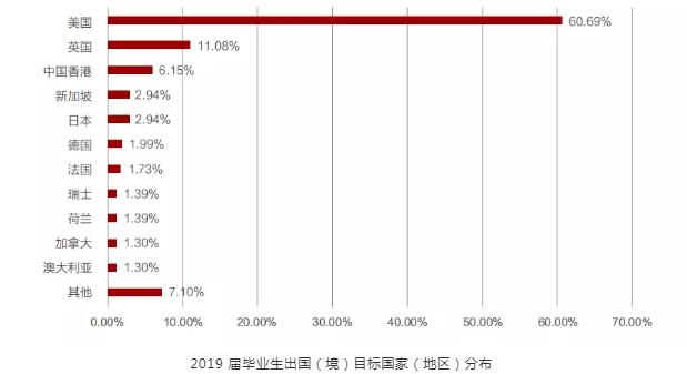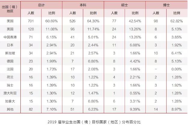 清华大学2019届毕业生出国(境)深造的人数为1035人,毕业生出国(境)深造首选为美国,占毕业生总人数的10.2%; 其次为英国(1.3%)和中国香港特别行政区(0.9%)。