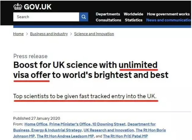 1月27日,约翰逊宣布推出“全球精英签证”(Global Talent visa),以吸引世界上最顶尖的科学家、数学家、研究人员、技术人才来英定居。