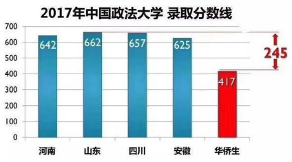 同样是满分750分,在一些省份,华侨生的录取分数线比统招生低了约200分。
