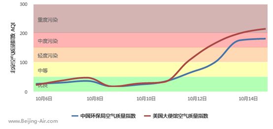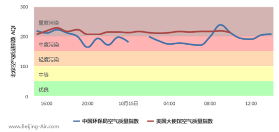 截至2018-10-15 14:00 实时数据,“全国重点城市空气质量指数排行榜”中共计319个城市中,北京市仅次于石家庄市、廊坊市,位列倒数第三名重度污染城市。