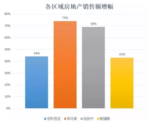 据数据显示,利马索尔销售增长74%,拉纳卡销售增长69%,尼科西亚和帕福斯涨幅分别为44%和43%。