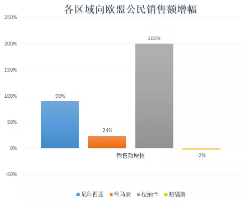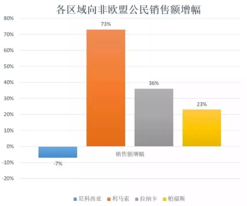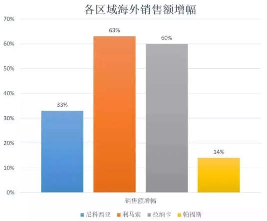 四个区域的销量都有所增长,利马索尔的销售额增长63%,拉纳卡的销售额增长60%,尼科西亚的销售额增长33%,帕福斯的销售额增长14%。