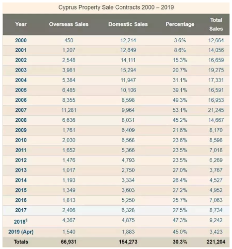 2019年4月,海外(非塞浦路斯)市场的房地产销售额增长了32%,其中429份销售合同存入,而2018年4月为326份。