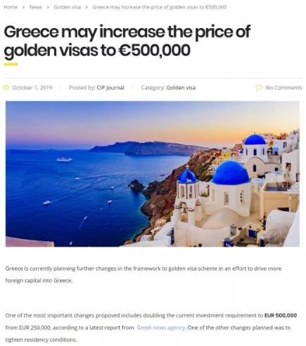 然而,就在数天前,希腊当地媒体Sofokleousin报道,希腊政府正在考虑重塑该国的黄金签证项目,将目前要求的25万欧最低投资额翻番至50万欧,并引入强制居留要求和最低年度支出要求。这也算委婉地表达了要涨价的意愿: