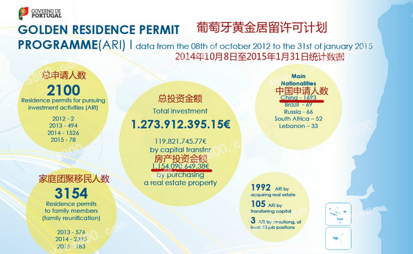 1. 2012年10月8日至2015年1月31日,累计成功获得“葡萄牙黄金居留签证”的人数已达2100人,投资总金额已超过12.7亿欧元。
