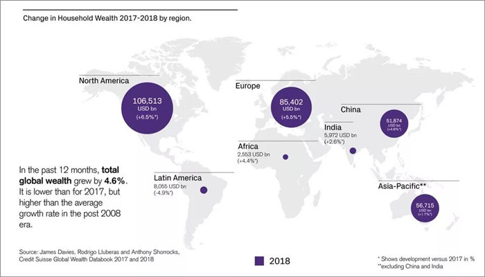 报告显示,截至2018年中期的12个月内,全球总财富增加了14万亿美元,达到317万亿美元,增长率约为4.6%。其中,75%的增长率来自中国和欧洲、印度的增长总和。个人平均财富排名前三的国家分别是瑞士、澳大利亚和美国。