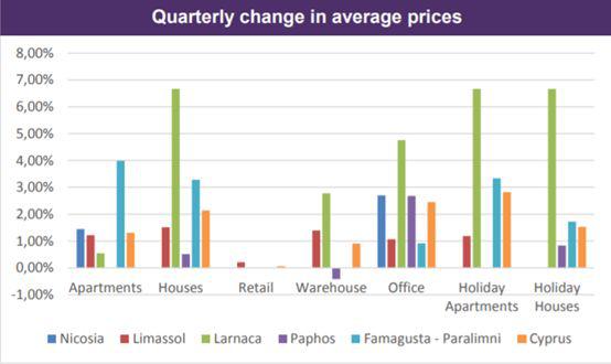 与2018年第一季度相比,别墅和公寓价格分别上涨1.3%和2.1%。报告所示,拉纳卡的房价季度涨幅最大(上涨6.7%),帕福斯的住宅价格保持稳定。