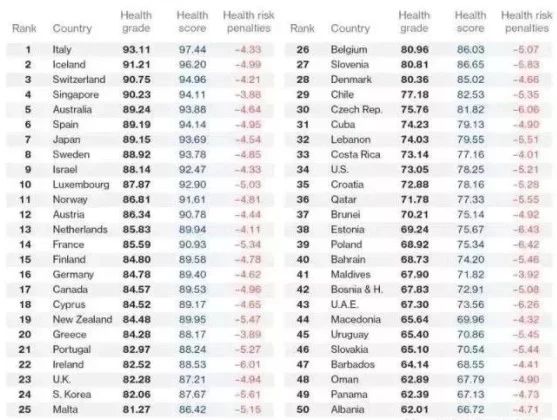 意大利、冰岛、瑞士、新加坡和澳大利亚分别位列1-5名,美国列34位。彭博社依据世界卫生组织(WHO)、联合国人口署和世界银行的数据,考评了预计寿命、死亡原因、健康威胁、血压情况、吸烟情况、营养不良情况及饮用水是否洁净等指标。