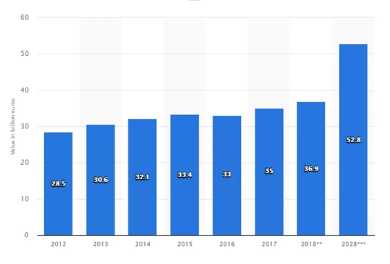 随着旅游人数逐年增长,希腊旅游业推动GDP逐年上升,2018年到达369亿欧元。预测到2028年,旅游业将为希腊GDP贡献约528亿欧元。