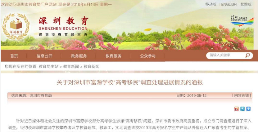 深圳教育局发布了《关于对深圳市富源学校“高考移民”调查处理进展情况的通报》,里面提到在深圳市富源学校2019年高考报名考生中,有32名考生属“高考移民”,弄虚作假获取广东省报考资格。对上述32名考生,取消其在深圳市的高考报名资格。