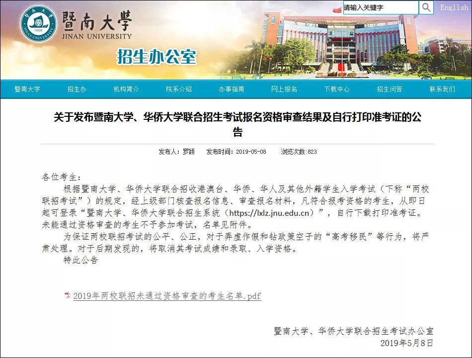 5月8日,暨南大学招生办公室网站上发布公告,称根据暨南大学、华侨大学联合招收港澳台、华侨、华人及其他外籍学生入学考试(下称“两校联招考试”)的规定,经上级部门核查报名信息、审查报名材料,未能通过资格审查的考生将不予参加考试。